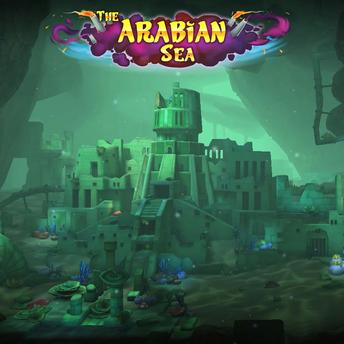 The Arabian Sea is the third location in Hungry Shark World. It requires a minimum of eight sharks. The setting seems to take place before sunset with a partly cloudy sky. Due to the time of day, the clouds appear to be yellow. The water in this area is turquoise green unless you go to the left of the map where it is brownish-green due to the pollution in the area. This seems to be most the polluted area in the game, as junk is rather common and spilled oil can be found near the oil rig and pipes.
