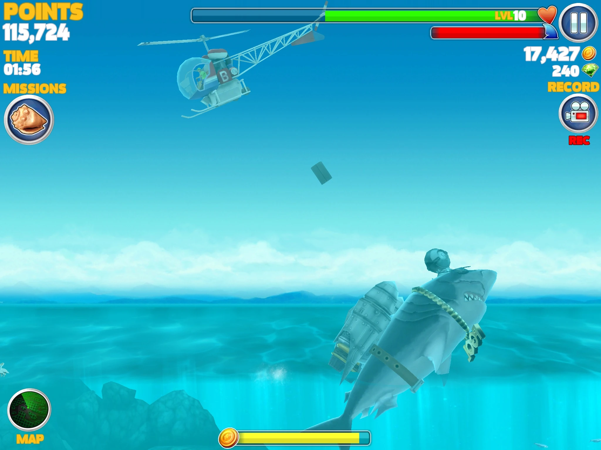 The barrels which the helicopter drops are often called bombs, although they were actually depth charges. Megalodon, and Big Daddy also can eat the helicopter's depth charges. The only way to destroy a helicopter is by jumping on the pilot, paying attention to the rotors, because, if your shark jumps on them, he will be damaged. When the pilot is killed, the entire helicopter explodes. Sometimes, eaten pilots will give you a gem.