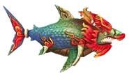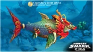 The Legendary Great White is a great white shark that has a lot of similarities to the appearance of dragons from Eastern mythology, such as horns, tattoo resemblances on his body/scales, catfish-like whiskers, and thick, red mane. He seems to lack gills, unlike his two counterparts.