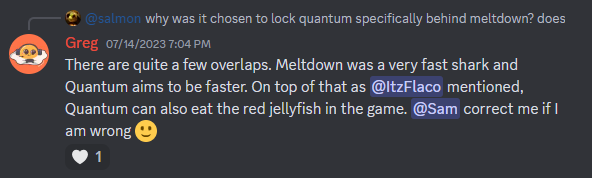 A developer confirmed that Quantum is intended to surpass Meltdown Shark, as Quantum is faster, can also eat Red Jellyfish, and requires Meltdown to unlock him.